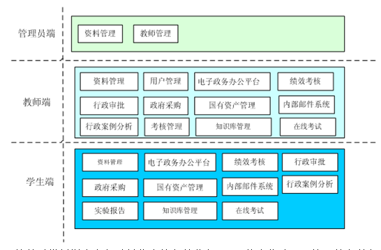 本教(jiao)(jiao)學(xue)(xue)(xue)平臺(tai)軟件以(yi)模擬學(xue)(xue)(xue)生在(zai)行政單位中(zhong)的各種(zhong)業務(wu),運用信息化(hua)建設環境(jing)下(xia)的各種(zhong)角色、功能配置,以(yi)各業務(wu)關系(xi)和流程作為主要(yao)實(shi)踐教(jiao)(jiao)學(xue)(xue)(xue)的手段,配以(yi)教(jiao)(jiao)師強(qiang)大的后臺(tai)管理功能和教(jiao)(jiao)學(xue)(xue)(xue)工具,滿足電子政務(wu)及相關學(xue)(xue)(xue)科(ke)的教(jiao)(jiao)師運用現代化(hua)教(jiao)(jiao)學(xue)(xue)(xue)工具開展網絡教(jiao)(jiao)學(xue)(xue)(xue)和實(shi)踐教(jiao)(jiao)學(xue)(xue)(xue)的要(yao)求。