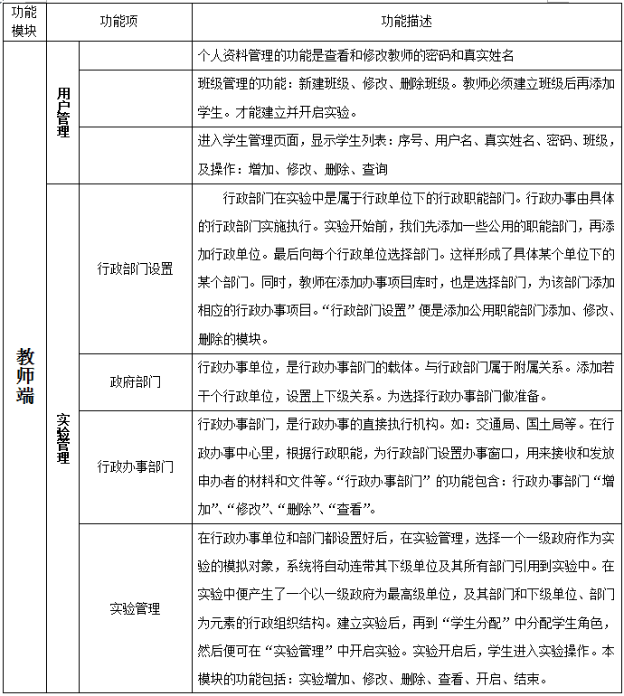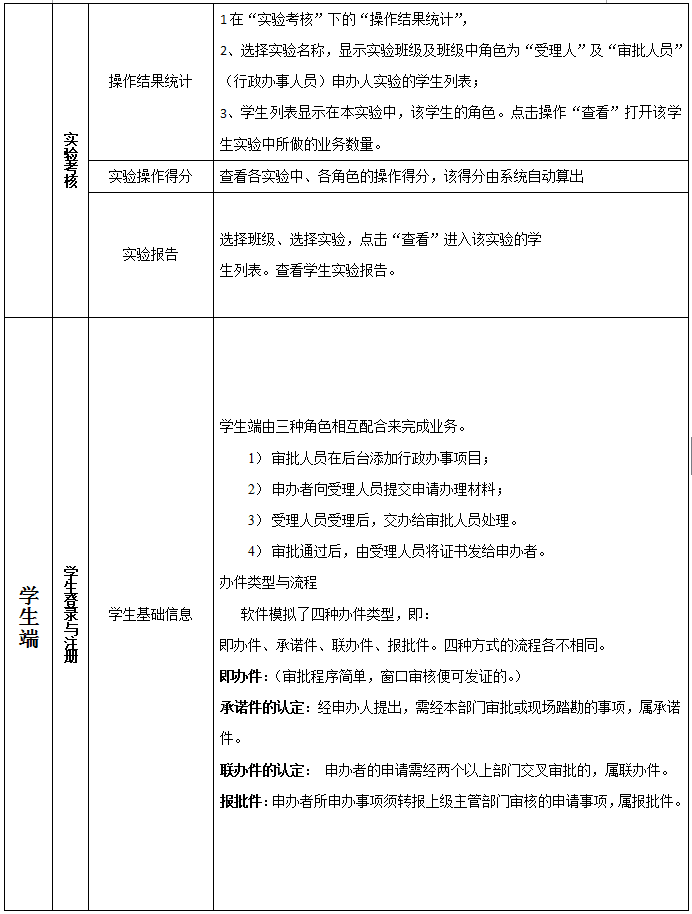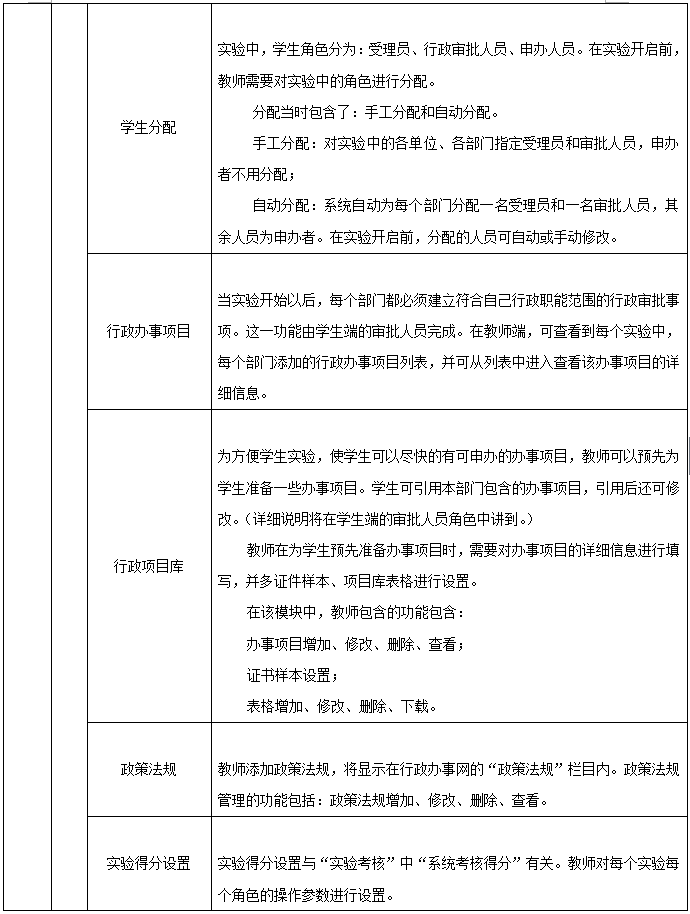 3、教師端(duan):行(xing)政部(bu)門(men)設(she)置、政府部(bu)門(men)、行(xing)政辦(ban)事(shi)部(bu)門(men)、實驗管(guan)理、學生分(fen)配(pei)、行(xing)政辦(ban)事(shi)項(xiang)目、行(xing)政項(xiang)目庫(ku)、政策(ce)法規(gui)、實驗得分(fen)設(she)置、操作結果(guo)統計、實驗操作得分(fen)、實驗報告