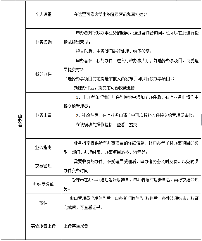 8、學生在(zai)實驗(yan)中分別扮演申辦者(zhe)、行政(zheng)部門受(shou)理員(yuan)、行政(zheng)審批員(yuan)。申辦者(zhe)可以(yi)通過行政(zheng)辦事大廳或網上(shang)辦事大廳提交(jiao)辦件申請材料。