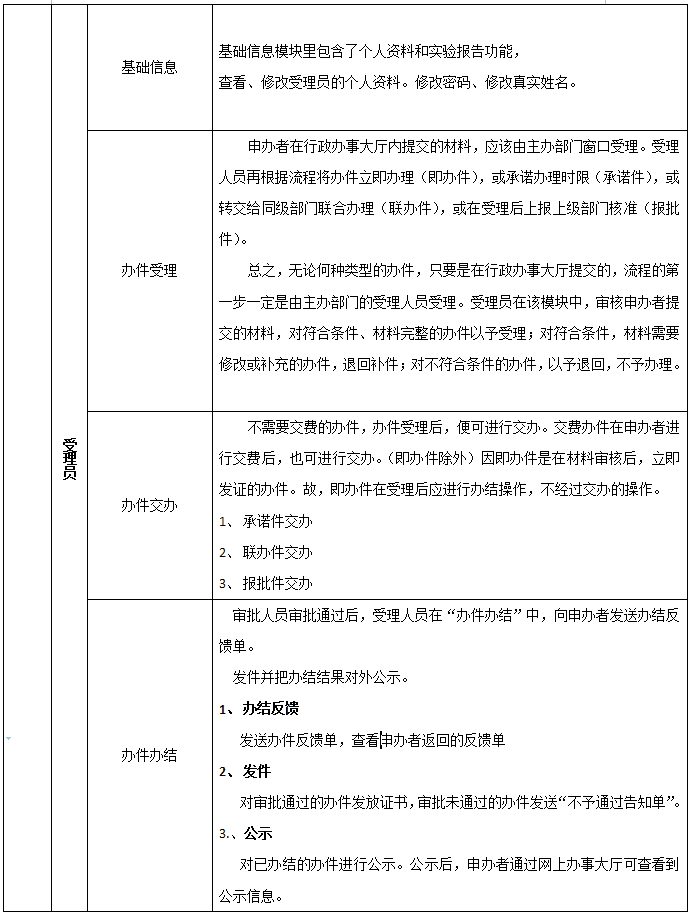 8、受(shou)理員(yuan):接受(shou)業(ye)務咨(zi)詢,受(shou)理業(ye)務,具有受(shou)理、退辦(ban)、補辦(ban)、交(jiao)辦(ban)、轉辦(ban)等(deng)功能(neng)。辦(ban)件辦(ban)結后,還具備公示、發件、辦(ban)件統計的功能(neng)。同(tong)時,受(shou)理員(yuan)還可以督辦(ban)、催辦(ban)、發布網(wang)上公告、政務公開、政策(ce)法規(gui)信(xin)息管理等(deng)。