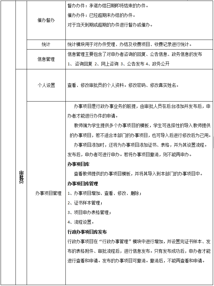 9、審批辦事員:辦事項目(mu)(mu)管(guan)理(辦事項目(mu)(mu)庫、辦事項目(mu)(mu)管(guan)理、辦事項目(mu)(mu)發布),對辦事項目(mu)(mu)進行添加、管(guan)理、證書樣本、表格、流(liu)程(cheng)進行管(guan)理。