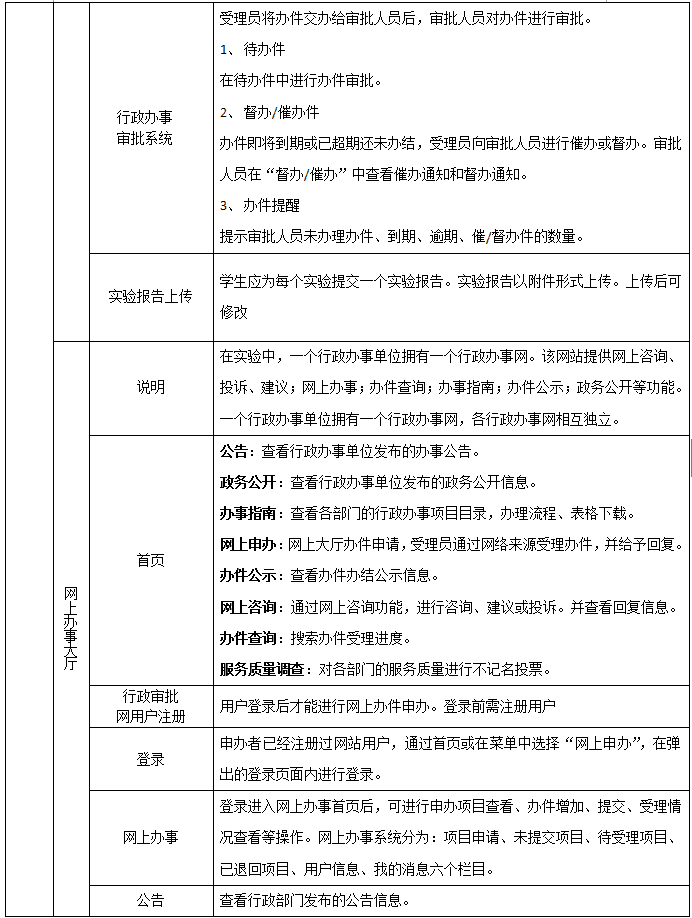 6、學(xue)生在實驗中(zhong)分別(bie)扮演申(shen)辦(ban)(ban)(ban)(ban)(ban)者(zhe)、行(xing)(xing)政(zheng)(zheng)部門受理員、行(xing)(xing)政(zheng)(zheng)審批員。申(shen)辦(ban)(ban)(ban)(ban)(ban)者(zhe)可以通過行(xing)(xing)政(zheng)(zheng)辦(ban)(ban)(ban)(ban)(ban)事(shi)大廳或網上辦(ban)(ban)(ban)(ban)(ban)事(shi)大廳提交辦(ban)(ban)(ban)(ban)(ban)件(jian)(jian)申(shen)請材料。各(ge)部門都對應著在行(xing)(xing)政(zheng)(zheng)辦(ban)(ban)(ban)(ban)(ban)事(shi)大廳的(de)(de)(de)一個窗口,受理員受理后,根(gen)(gen)據各(ge)辦(ban)(ban)(ban)(ban)(ban)事(shi)項目不同審批流程,交辦(ban)(ban)(ban)(ban)(ban)、上報或聯辦(ban)(ban)(ban)(ban)(ban)、即辦(ban)(ban)(ban)(ban)(ban)。辦(ban)(ban)(ban)(ban)(ban)事(shi)項目自(zi)(zi)定義和流程自(zi)(zi)定義是本軟件(jian)(jian)最大的(de)(de)(de)特點之(zhi)一。學(xue)生可以根(gen)(gen)據自(zi)(zi)己部門的(de)(de)(de)行(xing)(xing)政(zheng)(zheng)職責,添加相(xiang)關(guan)的(de)(de)(de)辦(ban)(ban)(ban)(ban)(ban)件(jian)(jian)并發布。