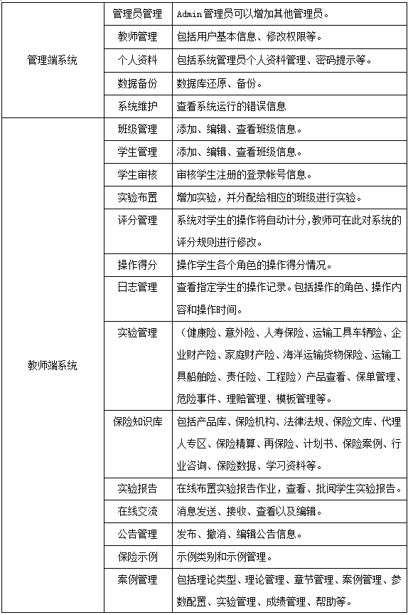 學(xue)生通過飾演保(bao)險(xian)(xian)(xian)業務流(liu)程中的(de)客(ke)戶、代理人(ren)、經紀公(gong)司、人(ren)壽保(bao)險(xian)(xian)(xian)公(gong)司、財(cai)(cai)產保(bao)險(xian)(xian)(xian)公(gong)司五種角色(se),進入“人(ren)壽保(bao)險(xian)(xian)(xian)”和“財(cai)(cai)產保(bao)險(xian)(xian)(xian)”實踐平臺,從展業投保(bao)環節開始,至索賠理賠為(wei)止,全面操練(lian)保(bao)險(xian)(xian)(xian)核(he)(he)心(xin)業務中的(de)投保(bao)、承保(bao)、核(he)(he)保(bao)、變更、理賠、核(he)(he)賠等(deng)流(liu)程,使學(xue)生的(de)知識(shi)結(jie)構提(ti)升,彌補實踐業務操作(zuo)的(de)缺乏,實現對(dui)人(ren)壽保(bao)險(xian)(xian)(xian)、運(yun)輸(shu)工(gong)(gong)具車輛險(xian)(xian)(xian)、企(qi)業財(cai)(cai)產險(xian)(xian)(xian)、家(jia)庭財(cai)(cai)產險(xian)(xian)(xian)、海洋(yang)運(yun)輸(shu)貨物保(bao)險(xian)(xian)(xian)、運(yun)輸(shu)工(gong)(gong)具船舶險(xian)(xian)(xian)、責任(ren)險(xian)(xian)(xian)、工(gong)(gong)程險(xian)(xian)(xian)的(de)熟悉、掌握,對(dui)保(bao)險(xian)(xian)(xian)業務的(de)主要工(gong)(gong)作(zuo)流(liu)程有一(yi)個清晰的(de)輪(lun)廓,為(wei)學(xue)以致用打下堅(jian)固的(de)基(ji)礎。