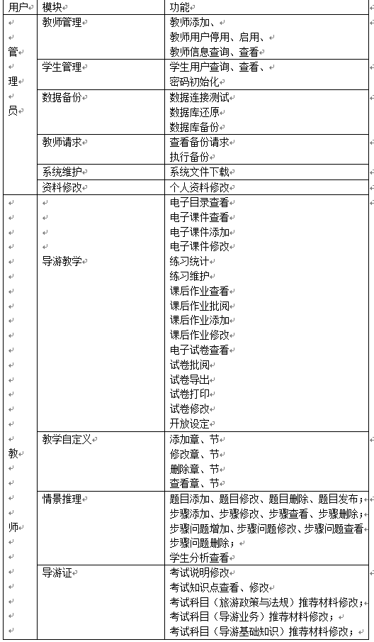 該導游(you)業(ye)務與(yu)技能(neng)(neng)教(jiao)學軟件在功(gong)(gong)能(neng)(neng)上,以(yi)管(guan)理員、教(jiao)師端、學生端三種權(quan)限(xian)設置各自功(gong)(gong)能(neng)(neng),完全(quan)能(neng)(neng)滿足(zu)旅游(you)業(ye)務與(yu)機能(neng)(neng)教(jiao)學要求。平臺通過精彩的(de)內容、強(qiang)大的(de)功(gong)(gong)能(neng)(neng)、友好(hao)的(de)界面,可(ke)靠(kao)的(de)性(xing)能(neng)(neng),實現導游(you)業(ye)務與(yu)機能(neng)(neng)教(jiao)學的(de)時代性(xing)跨越。