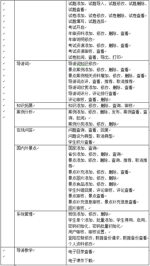 教師(shi)主要功(gong)能包括班(ban)級(ji)學(xue)生管(guan)(guan)(guan)理(li)(li)、導(dao)游基礎知(zhi)識管(guan)(guan)(guan)理(li)(li)、國內導(dao)游知(zhi)識管(guan)(guan)(guan)理(li)(li)、國外(wai)導(dao)游知(zhi)識管(guan)(guan)(guan)理(li)(li)、情景題目(mu)管(guan)(guan)(guan)理(li)(li)、導(dao)游證(zheng)考(kao)試(shi)資料管(guan)(guan)(guan)理(li)(li)、模擬考(kao)試(shi)、導(dao)游詞管(guan)(guan)(guan)理(li)(li)、導(dao)游案例管(guan)(guan)(guan)理(li)(li)、知(zhi)識拓展、案例分析(xi)管(guan)(guan)(guan)理(li)(li)、在(zai)線問答、國內外(wai)景點信(xin)息管(guan)(guan)(guan)理(li)(li)等。