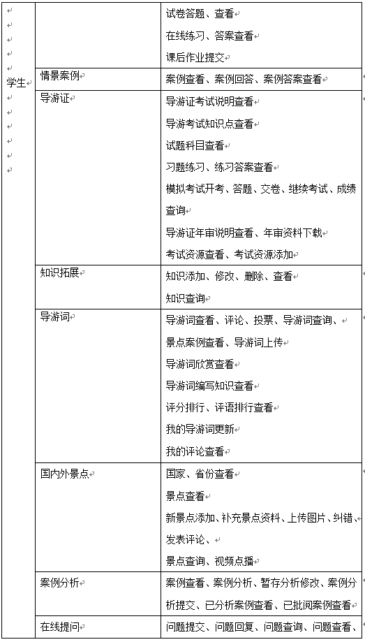 學(xue)生的主要功能是導游教學(xue)知識的學(xue)習、完成情景(jing)(jing)推理中包含的案例(li)及題目(mu)、導游證考試(shi)學(xue)習及模擬考試(shi)、導游拓展知識學(xue)習,同(tong)時可添(tian)加新的知識供(gong)其(qi)他(ta)同(tong)學(xue)學(xue)習、導游詞(ci)學(xue)習并編寫導游詞(ci)、國內外(wai)景(jing)(jing)點學(xue)習、案例(li)分析(xi)和在線提問(wen)。