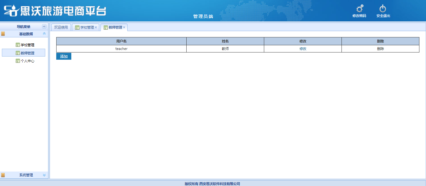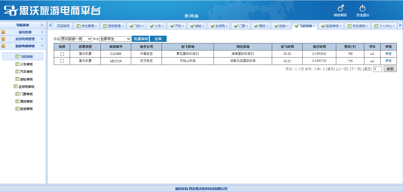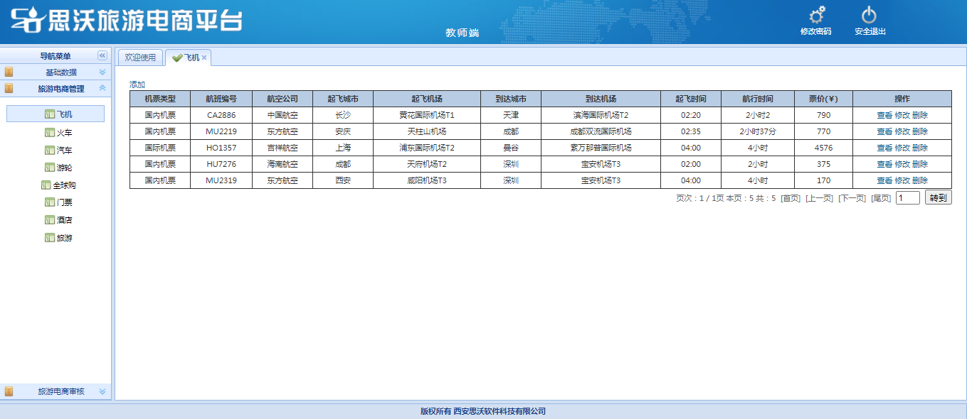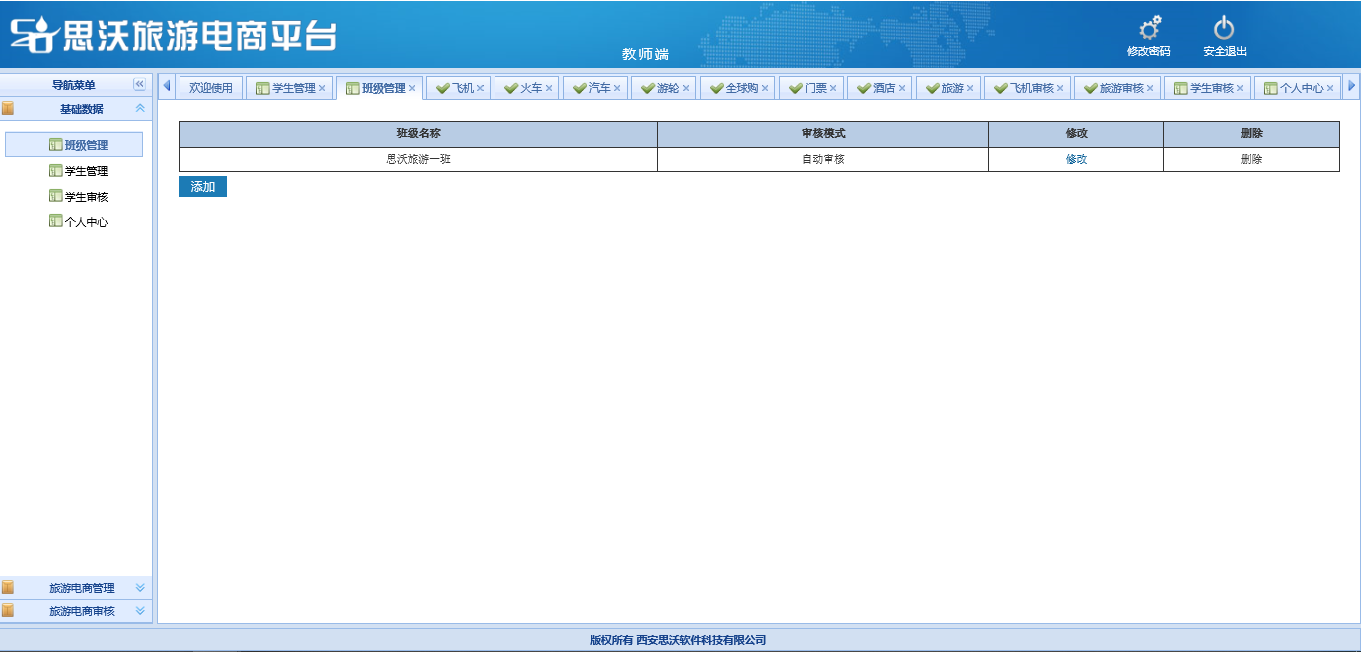 教師端包括:基(ji)礎數據(班級管理、學(xue)生管理、學(xue)生審核、個人信(xin)(xin)息(xi));旅(lv)游(you)(you)電(dian)商(shang)管理(對學(xue)生發(fa)(fa)布已審核的(de)(de)飛機(ji)(ji)、火車、汽(qi)車、游(you)(you)輪、全(quan)球購、門票、酒(jiu)店、旅(lv)游(you)(you)產品信(xin)(xin)息(xi)進(jin)行管理);旅(lv)游(you)(you)電(dian)商(shang)審核(對學(xue)生發(fa)(fa)布的(de)(de)飛機(ji)(ji)、火車、汽(qi)車、游(you)(you)輪、全(quan)球購、門票、酒(jiu)店、旅(lv)游(you)(you)產品信(xin)(xin)息(xi)進(jin)行進(jin)行審核)。