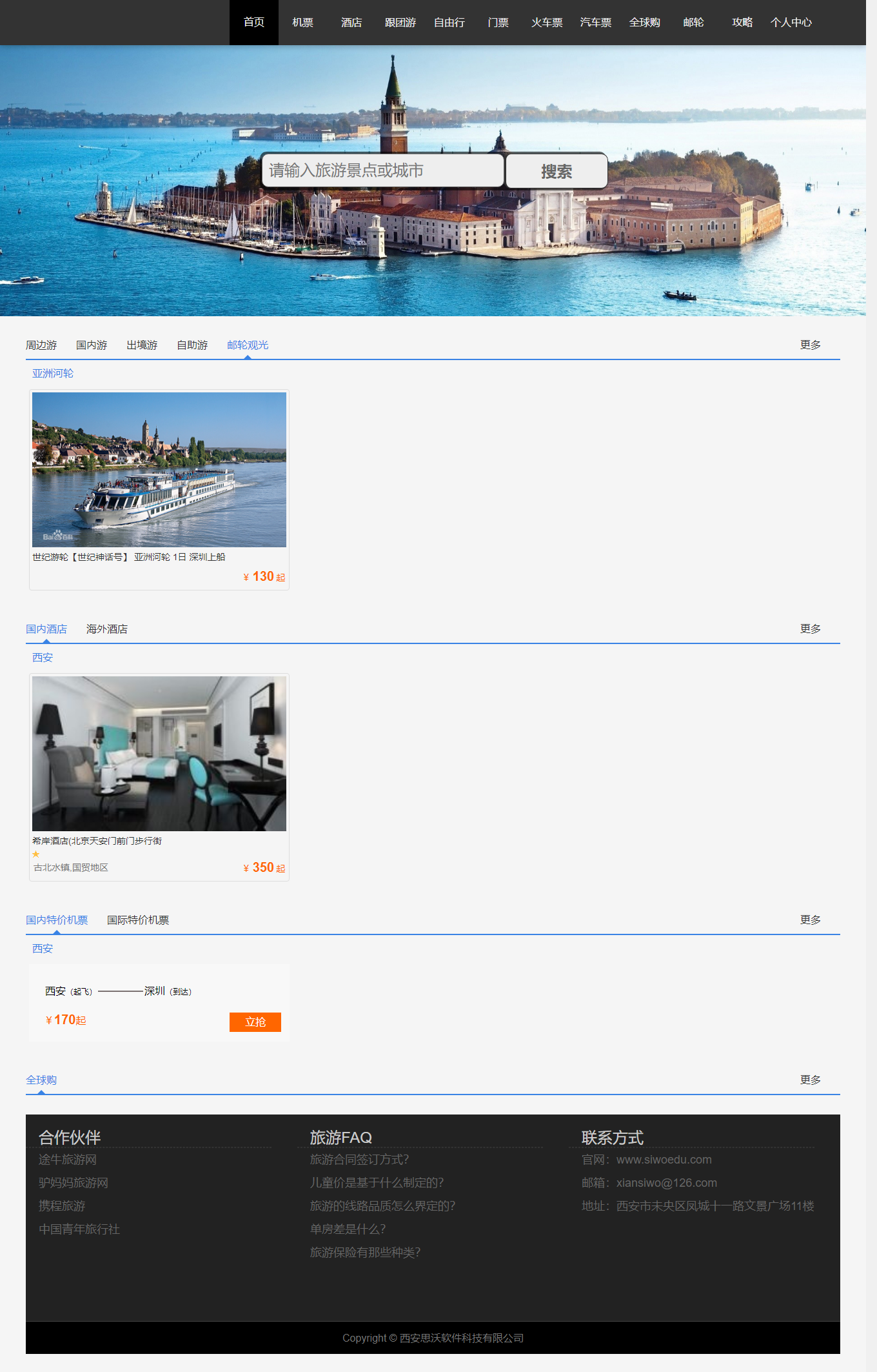 思沃旅(lv)(lv)(lv)游(you)電商(shang)(shang)平臺(tai)(tai)是以(yi)學(xue)(xue)生(sheng)學(xue)(xue)生(sheng)端平臺(tai)(tai)建設為實(shi)訓目的(de)(de),學(xue)(xue)生(sheng)可(ke)通(tong)過電商(shang)(shang)網站后(hou)臺(tai)(tai)旅(lv)(lv)(lv)游(you)信(xin)(xin)(xin)息(xi)管理(li)發布(bu),包(bao)括飛機、火(huo)車(che)、汽車(che)、游(you)輪、全球購、門票、酒(jiu)店、旅(lv)(lv)(lv)游(you)產品(pin)、旅(lv)(lv)(lv)游(you)攻略(lve)等信(xin)(xin)(xin)息(xi)添(tian)加發布(bu),在網站前臺(tai)(tai)進(jin)行信(xin)(xin)(xin)息(xi)展示。展示中學(xue)(xue)生(sheng)可(ke)通(tong)過前臺(tai)(tai)進(jin)行產品(pin)預訂操(cao)作、后(hou)臺(tai)(tai)進(jin)行對應訂單處理(li)。以(yi)互動模式(shi)完成旅(lv)(lv)(lv)游(you)電商(shang)(shang)的(de)(de)信(xin)(xin)(xin)息(xi)發布(bu)整合運營處理(li)的(de)(de)全流程操(cao)作。