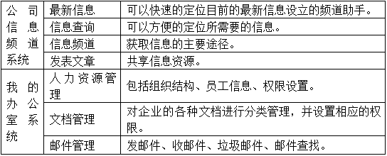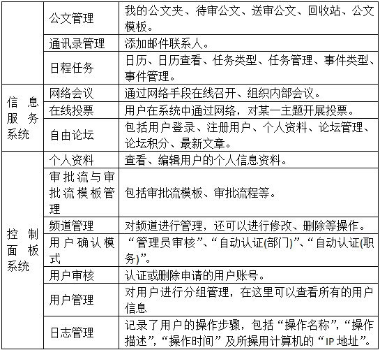 你(ni)(ni)可(ke)以(yi)向公(gong)(gong)(gong)共信息欄內發布新(xin)聞、通知……其(qi)他(ta)用(yong)戶可(ke)及時瀏(liu)覽最新(xin)信息。“我的(de)辦(ban)(ban)公(gong)(gong)(gong)室(shi)”模(mo)塊(kuai),你(ni)(ni)可(ke)以(yi)輕松管理(li)各類型文檔資料(liao);郵件(jian)系(xi)統(tong)方便了與其(qi)他(ta)人(ren)員的(de)聯系(xi);公(gong)(gong)(gong)文辦(ban)(ban)理(li)是辦(ban)(ban)公(gong)(gong)(gong)系(xi)統(tong)的(de)重點,公(gong)(gong)(gong)文審(shen)批流程(cheng)將在(zai)此(ci)進行;通訊(xun)錄讓你(ni)(ni)輕松查閱需要的(de)聯系(xi)方式。“日志任務”模(mo)塊(kuai)是個人(ren)事(shi)務計劃(hua)和實施的(de)小秘(mi)書(shu),提醒你(ni)(ni)待(dai)辦(ban)(ban)公(gong)(gong)(gong)文和待(dai)辦(ban)(ban)事(shi)件(jian)。你(ni)(ni)可(ke)以(yi)在(zai)線(xian)與其(qi)他(ta)成員交流,或者進行網絡會議、在(zai)線(xian)投票及自由討(tao)論。