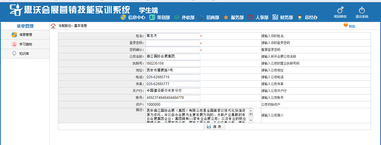 思(si)沃會(hui)展(zhan)(zhan)營銷模擬實(shi)(shi)訓系統以(yi)(yi)模擬會(hui)展(zhan)(zhan)公司的(de)策劃部(bu)(bu)、外聯部(bu)(bu)、招(zhao)(zhao)(zhao)商部(bu)(bu)、會(hui)展(zhan)(zhan)服(fu)務(wu)部(bu)(bu)、人事部(bu)(bu)、財務(wu)部(bu)(bu)以(yi)(yi)及(ji)總經辦7大業(ye)(ye)務(wu)部(bu)(bu)門為(wei)基礎而展(zhan)(zhan)開(kai)實(shi)(shi)驗操作的(de)。該教學平臺(tai)軟件(jian)業(ye)(ye)務(wu)內容包括了(le):項目上報審批、項目的(de)策劃安排、服(fu)務(wu)商管(guan)理(li)、人事招(zhao)(zhao)(zhao)聘與(yu)管(guan)理(li)、會(hui)展(zhan)(zhan)的(de)現場服(fu)務(wu)與(yu)合同(tong)(tong)管(guan)理(li)等(deng)等(deng),讓學生(sheng)通(tong)過實(shi)(shi)驗感受會(hui)展(zhan)(zhan)項目的(de)系統化管(guan)理(li)流程與(yu)業(ye)(ye)務(wu)操作內容,不但(dan)能夠了(le)解會(hui)展(zhan)(zhan)項目從立項審批到策劃、宣傳、招(zhao)(zhao)(zhao)展(zhan)(zhan)招(zhao)(zhao)(zhao)商、現場服(fu)務(wu)以(yi)(yi)及(ji)會(hui)后總結各個環節的(de)業(ye)(ye)務(wu),同(tong)(tong)時還可以(yi)(yi)掌(zhang)握各種(zhong)文案的(de)寫作技巧,從而讓學生(sheng)真(zhen)正的(de)理(li)解并(bing)掌(zhang)握會(hui)展(zhan)(zhan)這一(yi)行業(ye)(ye)的(de)各種(zhong)知識與(yu)業(ye)(ye)務(wu)要求。為(wei)學生(sheng)以(yi)(yi)后的(de)工作、學習(xi)提(ti)供了(le)一(yi)個實(shi)(shi)戰演練的(de)實(shi)(shi)訓平臺(tai),增(zeng)強(qiang)了(le)學生(sheng)進入(ru)工作崗(gang)位后的(de)實(shi)(shi)力。