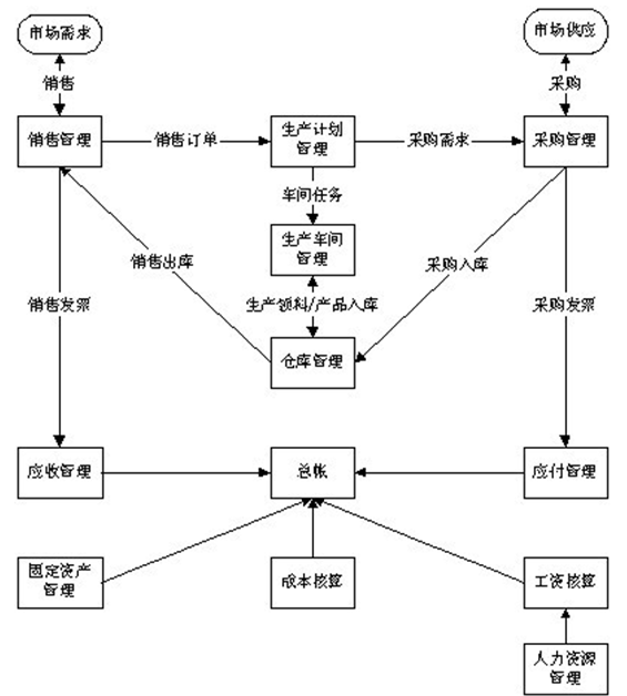 制造企(qi)業(ye)(ye)(ye)內部運作是以銷售、生產、采(cai)(cai)購、財務待為主的(de)(de)(de)經營模(mo)式,采(cai)(cai)用(yong)制造企(qi)業(ye)(ye)(ye)ERP管(guan)理(li)理(li)念,企(qi)業(ye)(ye)(ye)的(de)(de)(de)物流(liu)、資金流(liu)、和(he)(he)信(xin)(xin)息流(liu)統一起(qi)來進行(xing)管(guan)理(li),對企(qi)業(ye)(ye)(ye)所擁有的(de)(de)(de)人力、資金、材料、設備、方法(fa)(生產技術(shu))、信(xin)(xin)息和(he)(he)時間等(deng)各項資源(yuan)進行(xing)綜合平衡和(he)(he)充(chong)分考慮,最大(da)限度的(de)(de)(de)利用(yong)企(qi)業(ye)(ye)(ye)的(de)(de)(de)現有資源(yuan)取得最大(da)的(de)(de)(de)經濟效益(yi),科學、有效的(de)(de)(de)管(guan)理(li)企(qi)業(ye)(ye)(ye)人、財、物、產、供(gong)、銷等(deng)各項具體業(ye)(ye)(ye)務工作。包含如MRP、MTO、MTP、JIT等(deng)的(de)(de)(de)應用(yong)。如下流(liu)程(cheng):