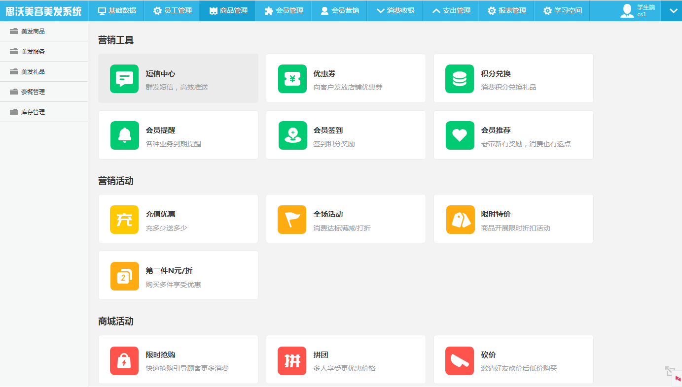 思沃(wo)美(mei)容美(mei)發(fa)模擬實訓系(xi)統是一(yi)款專業針(zhen)對美(mei)容美(mei)發(fa)行(xing)業開發(fa)的會(hui)員收銀管理(li)(li)系(xi)統,門店業務環節全面覆蓋(gai),會(hui)員管理(li)(li)&營銷(xiao)一(yi)步到位,適合學生真實模擬美(mei)容美(mei)發(fa)店進行(xing)會(hui)員管理(li)(li)、會(hui)員營銷(xiao)、店鋪收銀、打折積分、儲值消費、禮品兌(dui)換、商品管理(li)(li)、商品進銷(xiao)存、員工提(ti)成、財務報表等基本操作。